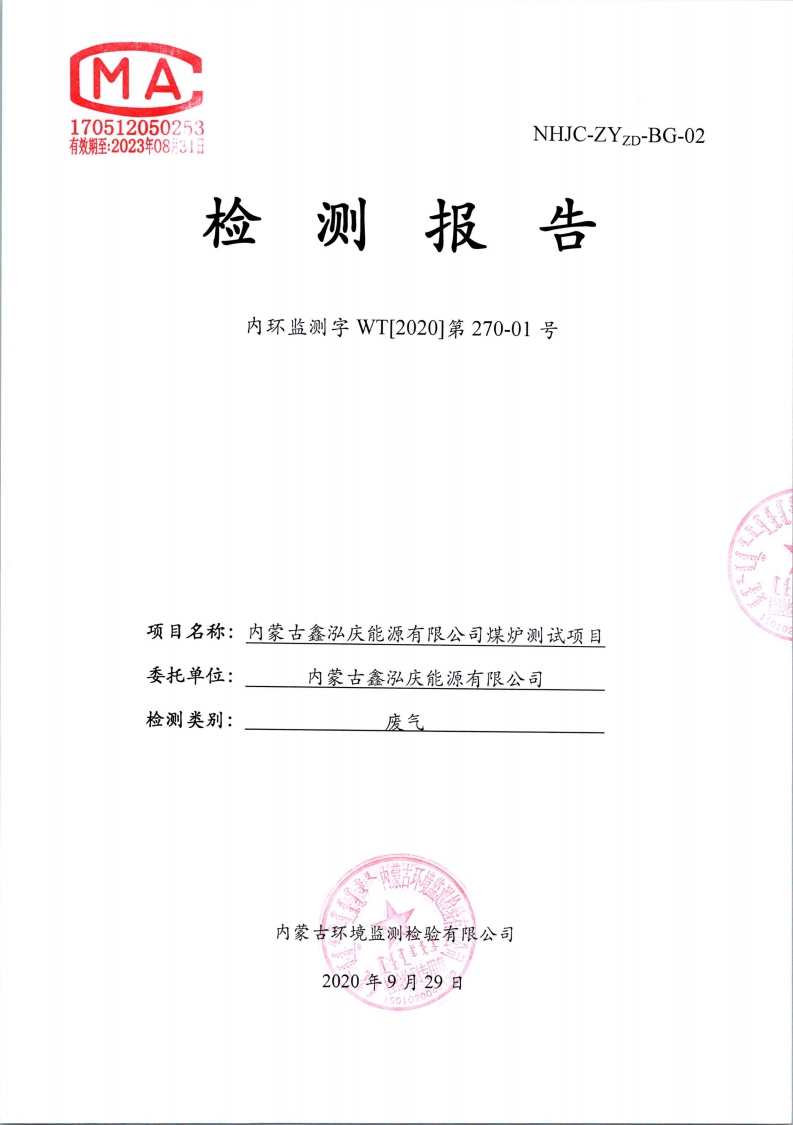 | 內(nèi)蒙古環(huán)境投資集團檢測報告-國標型煤廢氣檢測報告(干燒、水暖) | |